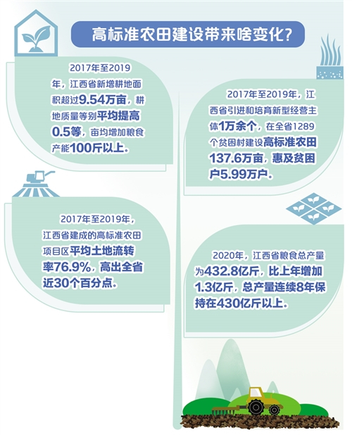 “高标准农田建设是保障粮食安全、提高农业综合生产能力的现实需求,也是加快农业农村现代化、全面推进乡村振兴的重要基础。”江西省农业农村厅副厅长刘光华介绍,在采取有力举措防止耕地“非粮化”、切实稳定粮食生产、牢牢守住国家粮食安全生命线的基础上,江西注重把高标准农田建设与提升粮食供给质量、助推脱贫攻坚、规模化经营、壮大集体经济等有机结合起来,不断提升农田综合利用效益。