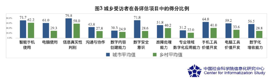 当下,这项任务已是刻不容缓。从社科院针对上千名城乡居民的调研结果来看,城乡“数字素养鸿沟”现象非常突出。以100分为满分,城市居民在数字素养评估中的平均得分为56.3分,乡村居民仅35.1分,差距高达21.2分;分职业来看,农民职业群体的数字素养得分仅18.6,比平均值低57%,远低于其他职业群体。