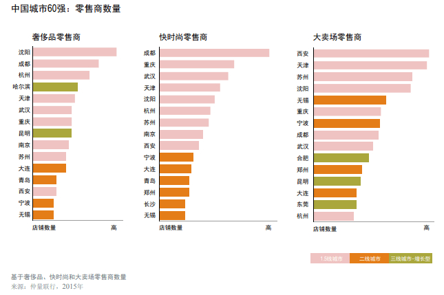 根据2015年仲量联行发布的《中国城市60强》报告,在其定义的“1.5线城市”中,成都的奢侈品零售商数量仅次于沈阳,居于第二位置,而重庆位于第7位,与昆明基本相当。