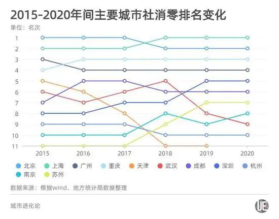 对于深圳与苏州来说,“十三五”则是消费“进击”的5年。从排名上看,深圳从第8位上升至第5位,爬升3位;而苏州则接连超过了南京、杭州等周边省会城市,一口气上升4位,居于第7位。