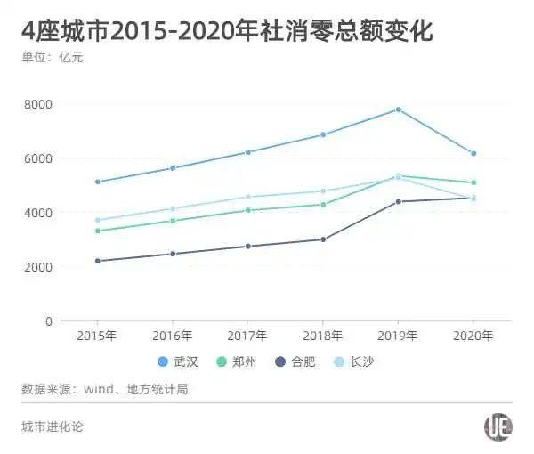 回看5年前,情况并非如此。当时,武汉的社会消费零售品总额位居全国第6,而到了2019年,武汉接连被成都、苏州反超,在去年疫情影响下,武汉排名进一步下跌。