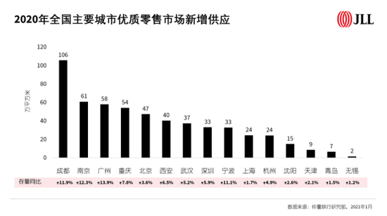 从商业市场规模上看,成都、广州在零售物业上优势明显。仲量联行数据显示,比较主要城市的存量优质零售物业面积,成都仅次于上海、北京两座城市,居于第三,且新增供应以106万平方米引领全国城市。