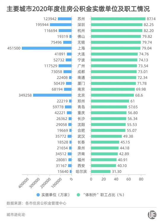 一般而言,“体制内”单位公积金覆盖面更广,“体制外”的外企、私企等公积金参与比例则相对较低。比较主要城市“体制外”实缴职工占比,位居前列的苏州(87.14%)、深圳(82.25%)、杭州(82.20%)、佛山(79.82%)、无锡(79.74%)等城市,其共同特点就是民营经济发达,而排名靠后的济南(42.89%)、福州(40.91%)、西安(40.1%)及哈尔滨(31.3%)等城市,“体制内”单位更为强势。