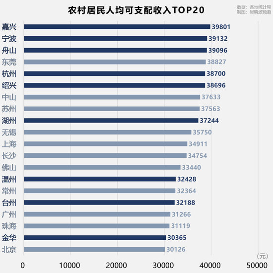 排名第一的嘉兴,录得近四万元的农村人均收入,这个数字是什么概念呢?大约和贵阳(40305元)、重庆(40006元)、哈尔滨(39791元)、南宁(38542元)这些直辖市或省会城市的城镇人均收入差不多。