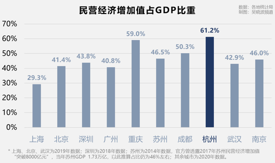 而杭州的民营经济增加值占比,低于浙江省的整体水平——66.3%。(浙江并非全国第一,低于福建)