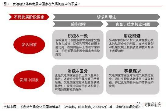 对于低碳转型 ,各经济体之间既存在共同利益,也面临不少矛盾。以欧盟为代表的多数发达国家凭借自身在减排、环保和可再生能源上的优势,在减排指标上表现非常积极。但在针对向发展中国家提供减排上的资金、技术转让和能力建设问题上,表现消极或极力回避,实质上隐含着通过有偿技术转让从中谋利的想法。发展中国家则认为大量的温室气体应当归咎于发达国家在历史上的大量累积排放,且发达国家人均排放量远超发展中国家,理应承担更多的减排责任。除此之外,发展中国家对发达国家的动机也表示怀疑,认为气候问题或是发达国家遏制发展中国家发展的理想借口。不仅是发展中经济体,即便像美国这样的发达经济体,出于经济增长的考虑也并不希望承担太多的减排责任。