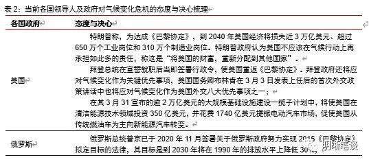 到目前为止,各国领导人对于气候问题的态度也存在一定的分歧。尽管作为全球最大的发展中国家,中国对于低碳转型毫不含糊。碳达峰和碳中和目标被写入正在编制的经济和社会发展五年规划和2035远景规划中,明确成为我国“十四五”污染防治攻坚战的主攻目标。从其他诸国领导人的表态来看,绝大多数的领导人对于气候问题的表态也都非常积极,尤其是主要发达经济体的政要。但是,对气候问题不热衷甚至是排斥的也大有人在。比较典型的就是美国前总统特朗普和巴西总统博尔索纳罗。特朗普退出巴黎协定人尽皆知,直到拜登当选总统美国才重新回归气候谈判。极右翼气候怀疑论者巴西总统博尔索纳罗及其内阁政府上台后,撤销了环境执法机构,修改环境保护法律法规,计划大规模开发雨林以实现本国的经济发展,导致当地生态环境持续恶化,对于气候问题更是较为强硬。