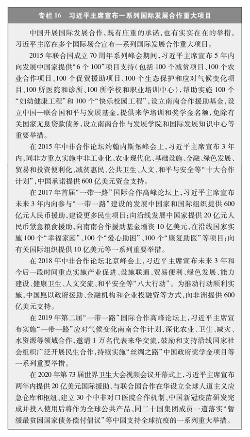 支持广大发展中国家减贫发展。新中国成立伊始,在国家百废待兴、财力紧张的情况下,即向有关国家提供援助,为发展中国家争取民族独立和解放、促进经济社会发展提供了支持。改革开放后,中国对外援助内容更加丰富、形式更加多样,促进了中国与其他发展中国家的共同发展。进入新时代,中国担负大国责任,推动对外援助向国际发展合作转型升级,为破解全球发展难题、落实联合国2030年可持续发展议程提出中国方案、贡献中国智慧、注入中国力量。习近平主席在多个国际重大场合宣布中国开展国际发展合作的一系列务实举措,已按期落实或正在按照进度有序推进(专栏16)。中国发起共建“一带一路”倡议,推动更大范围、更高水平、更深层次的区域经济社会发展合作,支持帮助相关国家更好实现减贫发展。据世界银行研究报告,共建“一带一路”将使相关国家760万人摆脱极端贫困、3200万人摆脱中度贫困。新中国成立70多年来,中国向亚洲、非洲、拉丁美洲和加勒比地区、大洋洲和欧洲等地区160多个国家和国际组织提供多种形式的援助,减免有关国家债务,为广大发展中国家落实千年发展目标提供帮助。