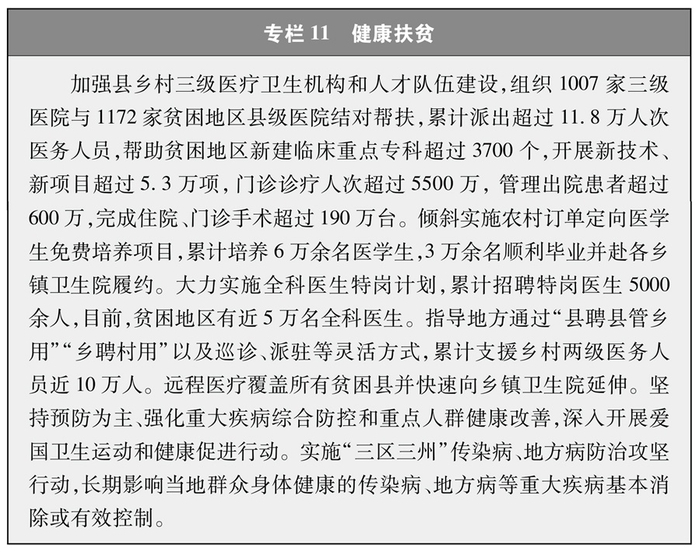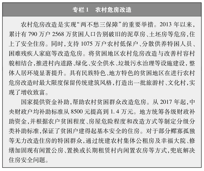 显示,贫困户全面实现不愁吃、不愁穿,平时吃得饱且能适当吃好,一年四季都有应季的换洗衣物和御寒被褥。贫困人口受教育的机会显著增多、水平持续提高,农村贫困家庭子女义务教育阶段辍学问题实现动态清零,2020年贫困县九年义务教育巩固率达到94.8%。持续完善县乡村三级医疗卫生服务体系,把贫困人口全部纳入基本医疗保险、大病保险、医疗救助三重制度保障范围,实施大病集中救治、慢病签约管理、重病兜底保障等措施,99.9%以上的贫困人口参加基本医疗保险,全面实现贫困人口看病有地方、有医生、有医疗保险制度保障,看病难、看病贵问题有效解决。实施农村危房改造,贫困人口全面实现住房安全有保障(专栏1)。实施农村饮水安全和巩固提升工程,累计解决2889万贫困人口的饮水安全问题,饮用水量和水质全部达标,3.82亿农村人口受益;贫困地区自来水普及率从2015年的70%提高到2020年的83%。