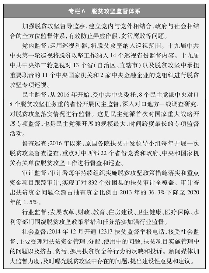 脱贫攻坚涉及面广、要素繁多、极其复杂,需要强有力的组织领导和贯彻执行。充分发挥党的政治优势、组织优势,建立中央统筹、省负总责、市县抓落实的脱贫攻坚管理体制和片为重点、工作到村、扶贫到户的工作机制,构建起横向到边、纵向到底的工作体系。各级党委充分发挥总揽全局、协调各方的作用,执行脱贫攻坚一把手负责制,中西部22个省份党政主要负责同志向中央签署责任书、立下军令状,省市县乡村五级书记一起抓。脱贫攻坚期内,贫困县党委政府正职保持稳定。有脱贫任务的地区,倒排工期、落实责任,抓紧施工、强力推进。脱贫攻坚任务重的地区,把脱贫攻坚作为头等大事和第一民生工程,以脱贫攻坚统揽经济社会发展全局。实行最严格的考核评估和监督检查,组织脱贫攻坚专项巡视,开展扶贫领域腐败和作风问题专项治理(专栏5),加强脱贫攻坚督导和监察(专栏6),确保扶贫工作务实、脱贫过程扎实、脱贫结果真实,使脱贫攻坚成果经得起实践和历史检验。建立健全干部担当作为的激励和保护机制,加大关心关爱干部力度,树立正确用人导向,引导广大干部在决胜脱贫攻坚中奋发有为、履职尽责。加强基层扶贫队伍建设,普遍建立干部驻村帮扶工作队制度,按照因村派人、精准选派的原则,选派政治素质好、工作能力强、作风实的干部驻村扶贫。广大驻村干部牢记使命、不负重托,心系贫困群众,扎根基层扶贫一线,倾心倾力帮助贫困群众找出路、谋发展、早脱贫。从2013年开始向贫困村选派第一书记和驻村工作队,到2015年,实现每个贫困村都有驻村工作队、每个贫困户都有帮扶责任人。截至2020年底,全国累计选派25.5万个驻村工作队、300多万名第一书记和驻村干部,同近200万名乡镇干部和数百万村干部一道奋战在扶贫一线。