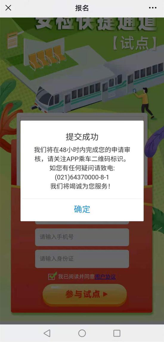 记者在现场也扫码体验了报名环节。扫码后,系统自动转到一则申请页面,需要填写姓名、手机号和身份证号,点击“参与试点”后即显示提交成功,无需再补充其他信息。提交后,并不是马上就能得到回复,需要48小时后才能得到结果。