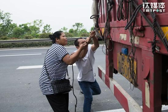 为了快速赶往下一个卸货点,他们没有蒙篷布就直接出发,结果在路上掉下来一件货物和三块板子,好在后面的司机开车追上来告诉他们。于是他们回车去捡掉下的东西,板子太沉,王静搬起来有些吃力。