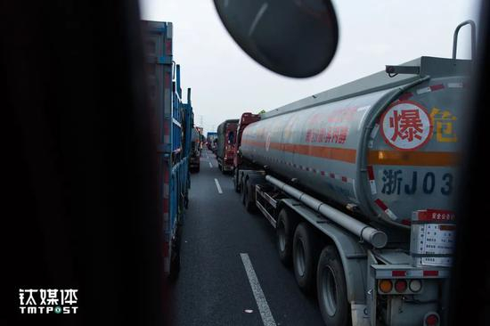 开了2个小时,在江苏境内遇到小范围堵车。开车最怕堵车,2008年南方冰灾,金强在京珠高速湖南段堵了两天两夜,车上东西吃完了,不舍得买高速上5块钱一个的馒头,金强和同伴只能吃货仓里的橘子充饥。2016年12月底,雾霾造成京台高速堵车,金强的车三天三夜原地未动,他亲眼看到旁边货车拉的牛羊因为没水喝饿死了,最后一天他们吃完了车上的食物,只能喝水,王静走出去四公里才买到水。