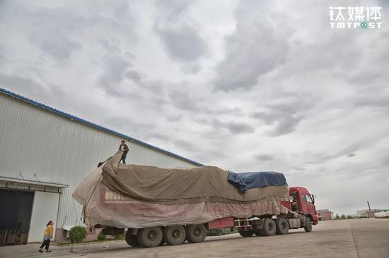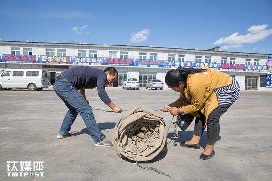 16日下午3点,他们抵达了终点站满洲里国际公路物流园。在园区卸货前,两人合力收起了油布。