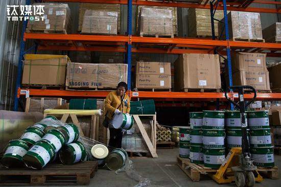 金强在外装货,王静在货主仓库里负责清点。货主的叉车不小心把货放倒了,仓库里没工人,王静帮着把这些装着油漆的筒子重新累起来。