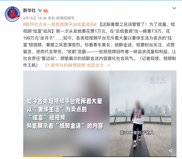 日前,新华社官微以#新华社点名一些短视频平台炫富成风# 为话题,对当下短视频平台中出现的各种昂贵的奢靡消费内容进行了点评,称:“如今,各类短视频平台充斥着大量以奢侈生活为卖点的‘炫富’短视频,奢靡之风愈演愈烈。”“一些短视频创作者一味追求流量和利益,让社会责任‘靠边站’,频繁展示的纸醉金迷内容腐化社会风气”,并表示,“这股奢靡之风该管管了!”