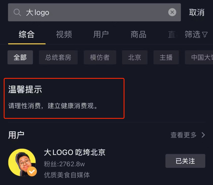 另外,在某短视频平台搜索“大logo”时,下面会出现一句温馨提示,“请理性消费,建立健康消费观。”
