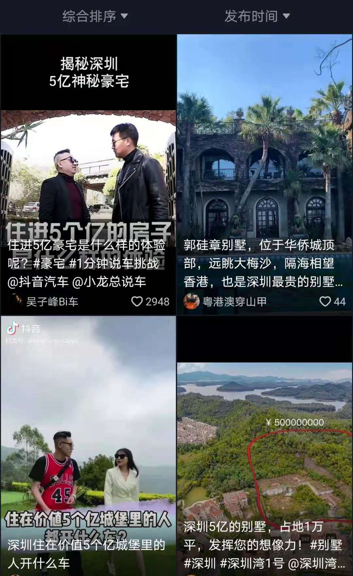 事实上,在多个短视频平台,每经小编发现,打着“揭秘”“体验”旗号,以豪宅、豪车、奢侈品、高昂消费为主题的短视频内容随处可见。