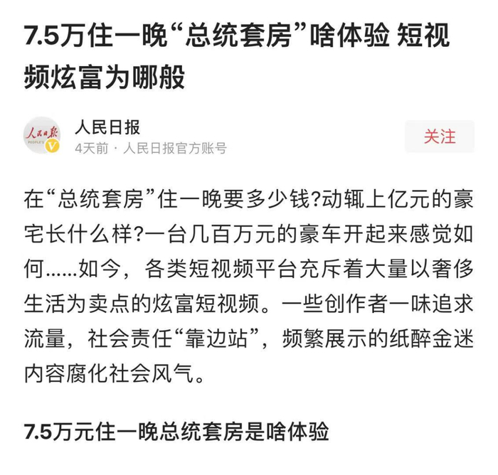 7.5万住一晚酒店、199万“坐月子” 央媒批:短视频炫富为哪般?