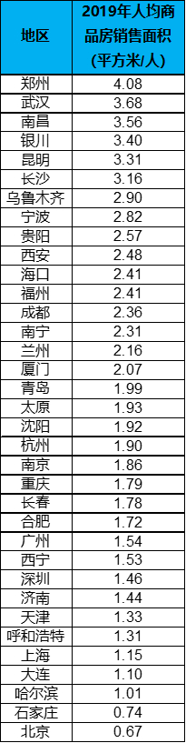 根据国家统计局数据,全国30个重点城市(拉萨资料缺)2019年人均商品房销售面积基本在1-4平方米/人,这代表了全国绝大部分城市的商品房供应情况。