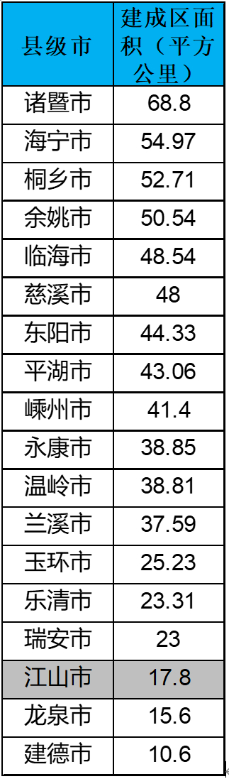 江山市的建成区面积仅17.8平方公里,在浙江县级市里排在倒数第3,是面积最大的诸暨的1/4左右。江山的代管市衢州,建成区面积也很小,仅为77.7平方公里,约为杭州的1/8左右。