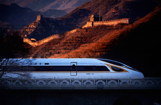 2019年12月30日,一列复兴号动车组在北京居庸关长城脚下呼啸而过。 雷声/摄
