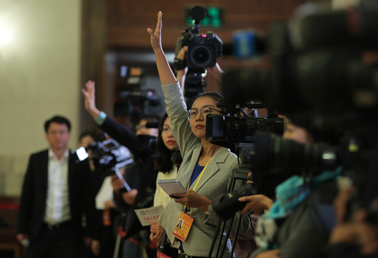 2017年10月18日,记者在人民大会堂十九大代表通道上举手提问。 赵青/摄