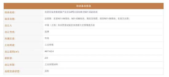记者查阅该地块出让资料,其出售方为中国(上海)自由贸易试验区临港新片区管理委员会,地块总面积达461142.4平方米,年限为50年,起拍价为5.1879亿元,增价幅度为500万元。