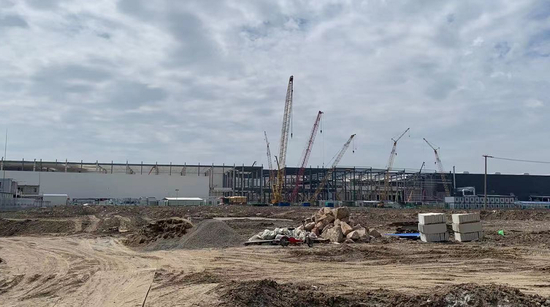另外,记者注意到,在特斯拉超级工厂二期附近还有吊车在施工,厂房顶钢结构已基本搭建完成。“这里可能是三期,或者叫2.5期,还会搭一些车间来满足生产所需。”一位工人告诉记者。