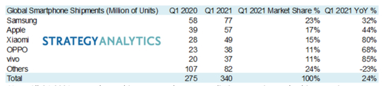 全球知名市场研究机构Strategy Analytics近日发布的《2021年Q1全球手机市场出货量报告》显示,今年一季度全球智能手机出货量为3.4亿部,同比增长24%,实现了2015年以来的最高增长。
