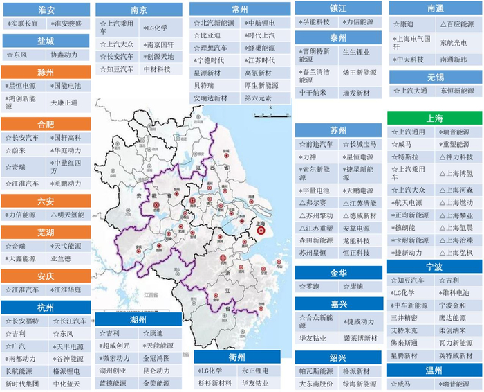 长三角新能源汽车及动力电池重点企业分布图