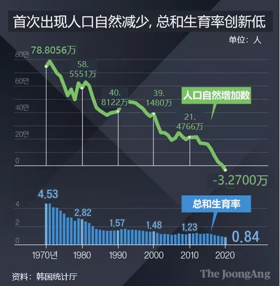 根据韩国统计厅公布的“2020年出生和死亡人口统计结果”,2020年韩国的总和生育率(每名女性一生平均生育的子女数)是0.84,为全球最低。这是韩国的生育率连续第二年在全球垫底。