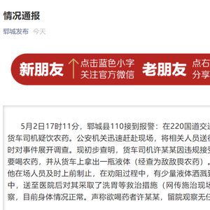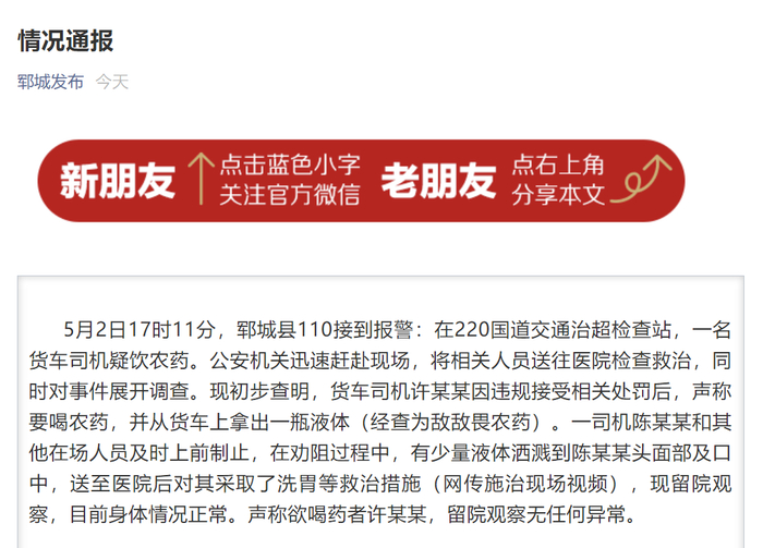 山东菏泽市郓城县委宣传部官方微信公众号“郓城发布”5月3日通报称,5月2日17时11分,郓城县110接到报警:在220国道交通治超检查站,一名货车司机疑饮农药。公安机关迅速赶赴现场,将相关人员送往医院检查救治,同时对事件展开调查。现初步查明,货车司机许某某因违规接受相关处罚后,声称要喝农药,并从货车上拿出一瓶液体(经查为敌敌畏农药)。一司机陈某某和其他在场人员及时上前制止,在劝阻过程中,有少量液体洒溅到陈某某头面部及口中,送至医院后对其采取了洗胃等救治措施(网传施治现场视频),现留院观察,目前身体情况正常。声称欲喝药者许某某,留院观察无任何异常。