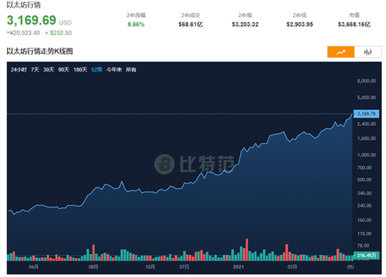 比特币和狗币在4月份都创下了历史新高,但5月份似乎是属于以太坊的月份。以太坊次突破 3000 美元创造新纪录。一年前的这一天它的价格才刚刚超过207美元,一年间暴涨14倍。