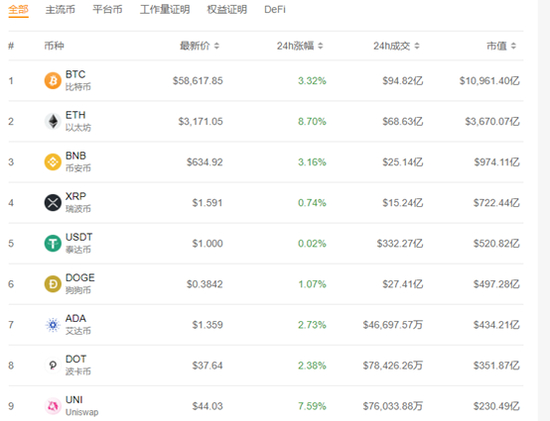 5月3日,市场 99%的加密货币看涨,其中作为全球最大规模加密货币的比特币一度站上59000美元/枚。