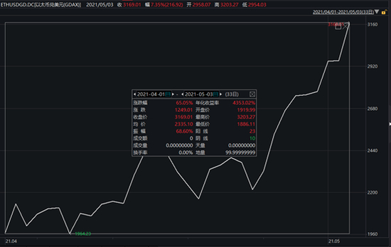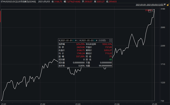 当月26日起,自最低2200美元下方,以太坊接连“闯关”,在5月3日,创下历史新高3000美元。