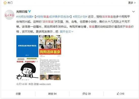 事实上,“宠物盲盒”并非新鲜事物,它不仅存在于电商平台,更扩散到多个网络平台。买家只需要支付9.9元或19.9元即可以买到一个“宠物盲盒”,卖家则宣称里面可能是某种名贵的猫或狗。