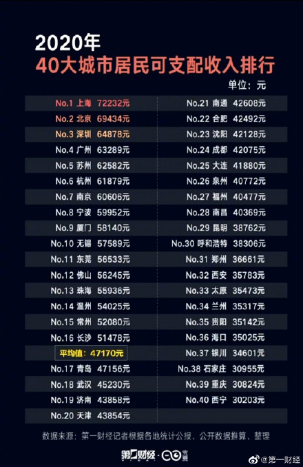 2020年全市居民人均可支配收入排行榜Top40,重庆以30824元排第39,差一丢丢就被挤出了前40行列。