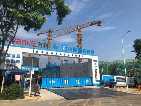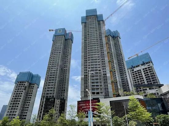 从现场的施工情况来看,项目已经接近封顶状态,楼栋的绿网已经脱落,有楼栋在铺设外立面装饰。
