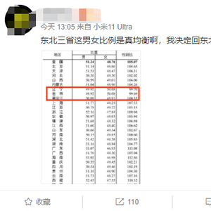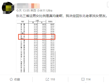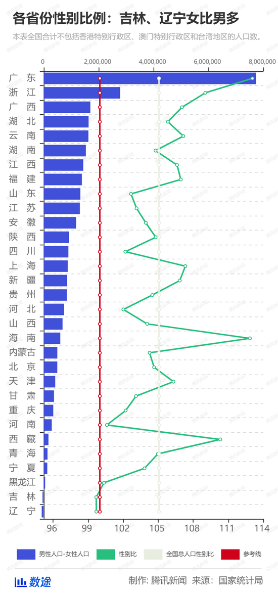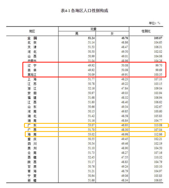 数据公布后,迅速引发热议,其中一个数据特别引起网友们的注意——东北三省可谓是性别比的“洼地”,吉林、辽宁是全国唯二的两个女多男少的省份,黑龙江的男女比例也接近1:1。而广东,则是性别比例中男性占比最高的省份。