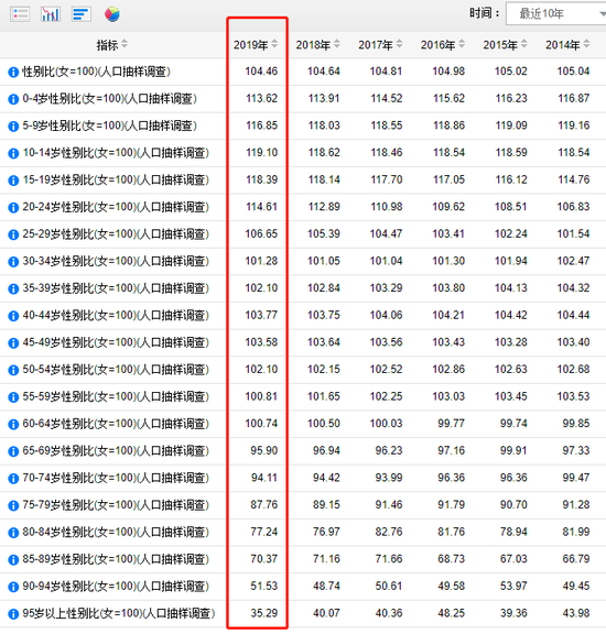 另外,据国家统计局网站公布的最近10年人口抽样统计数据显示,2019年的抽样统计男女性别比为104.46。按年龄段来分,10-14岁人群的性别比例中男性占比最高,男女占比为119.10,意味着每100个女性人口,对应的男性为119个。