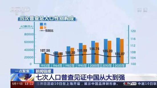 5月11日,第七次全国人口普查结果正式发布,公报显示,男性人口为72334万人,占51.24%;女性人口为68844万人,占48.76%。人口普查数据显示,全国总人口性别比为105.07,即是说,全国的男女比例为105.07:100。