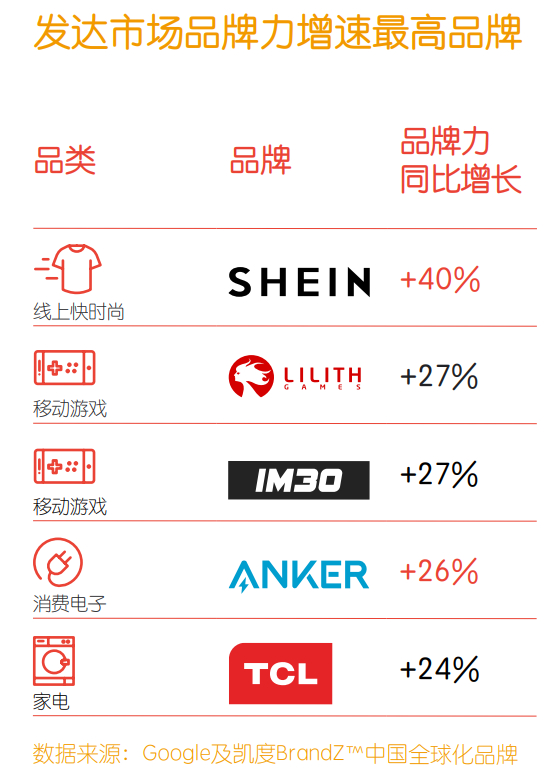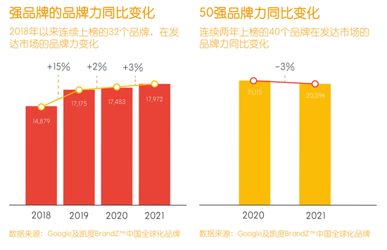 1. 尽管中国全球化品牌在发达市场的总体品牌力略有下降,但其中强大的品牌仍展现出了十足的韧性。