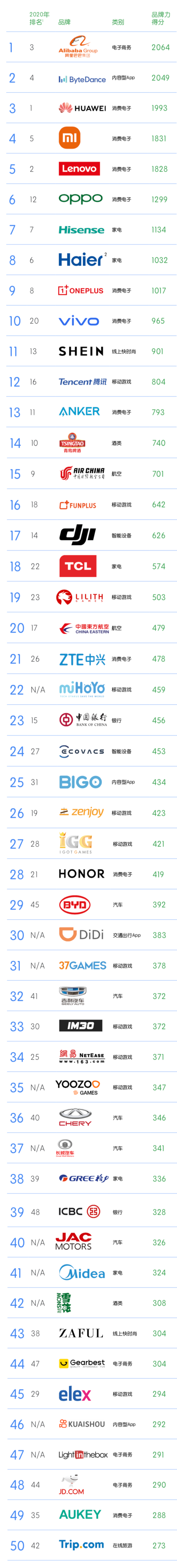 2021凯度BrandZ™中国全球化品牌50强榜单