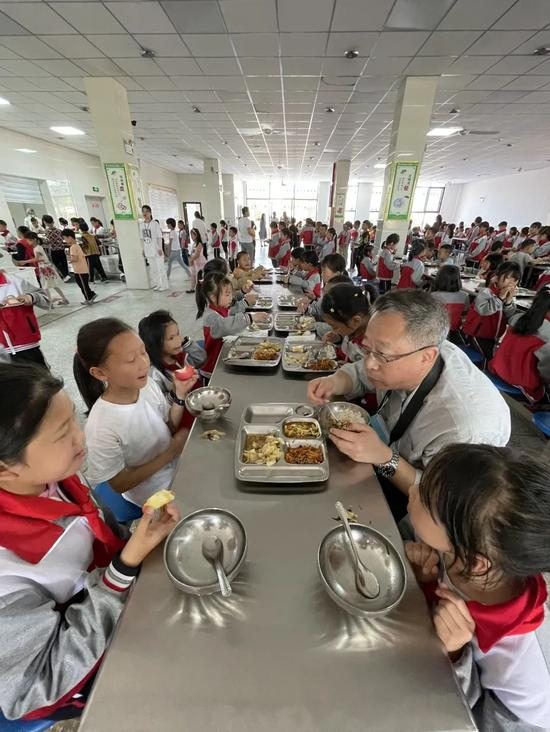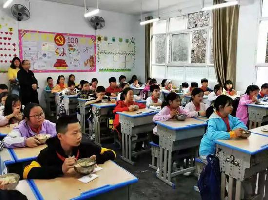 调研团队在贵州省罗甸县当地小学食堂和孩子们一起用餐