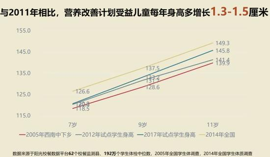 项目对促进孩子们身体健康发展的作用也十分明显,对照试验显示,得到膳食补助的学生,身高、体重和肺活量的增长都比没有得到膳食补助的学生更快。基金会监控数据显示,与2011年相比,2017年试点学生每年身高多增长了1.3-1.5厘米。