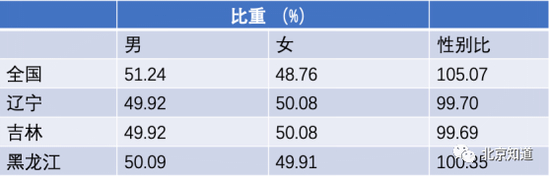 黑龙江性别比为100.35,即每100个女性,有100.35个男性。辽宁、吉林性别比分别为99.70和99.69,每100个女性,有不到100个男性,是全国仅有的两个“女多男少”的省份。