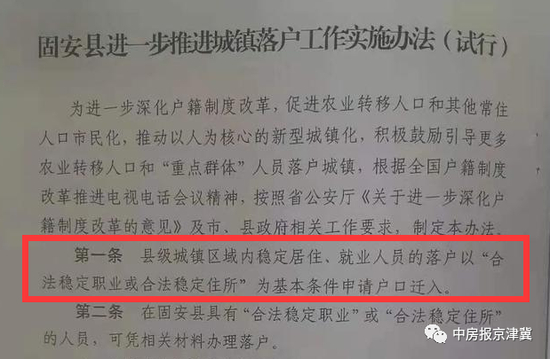 5月12日上午,固安县发布关于《固安县进一步推进城镇落户工作实施办法(试行)》通知。其中,第一条明确表示:县级城镇区域内稳定居住、就业人员的落户以“合法稳定职业或合法稳定住所”为基本条件申请户口迁入。这也代表着,固安县落户取消了社保要求,正式放开。