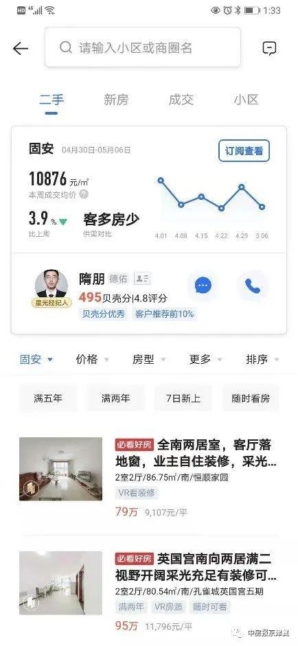在贝壳APP上则显示4月30日-5月6日当周,固安成交均价仅为10876元/平方米。
