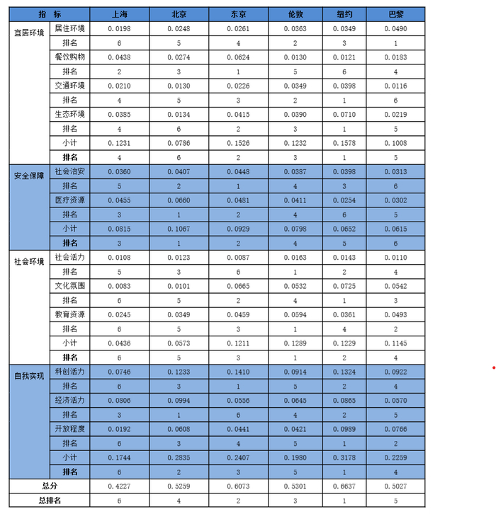 从综合测评结果看,纽约、东京、伦敦列前3位,得分分别为0.6636、0.6037和0.5301,上海得分仅0.4226。上海在社会环境和自我实现两大一级指标中排名均靠后,对人才的吸引力不强。